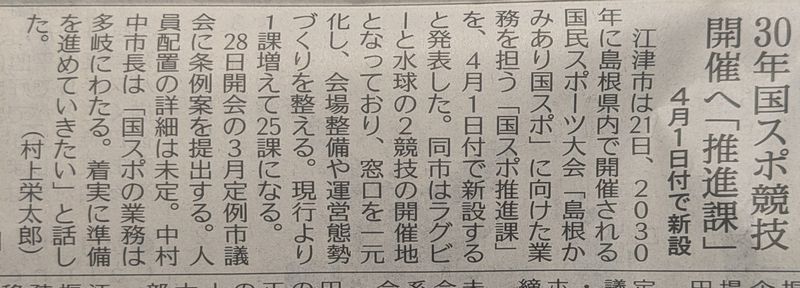 4月1日に、30年の「島根かみあり国スポ」に向けて、「国スポ推進課」を新設する。と。