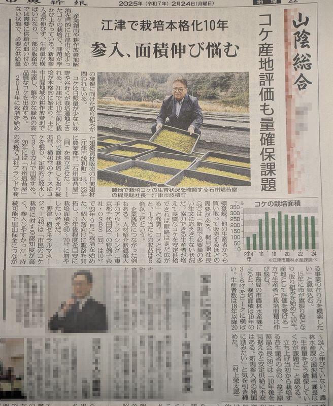 今朝の地方紙に、江津市のコケ栽培本格化10年を超えたが、参入者、栽培面積が伸び悩んでいる。と。