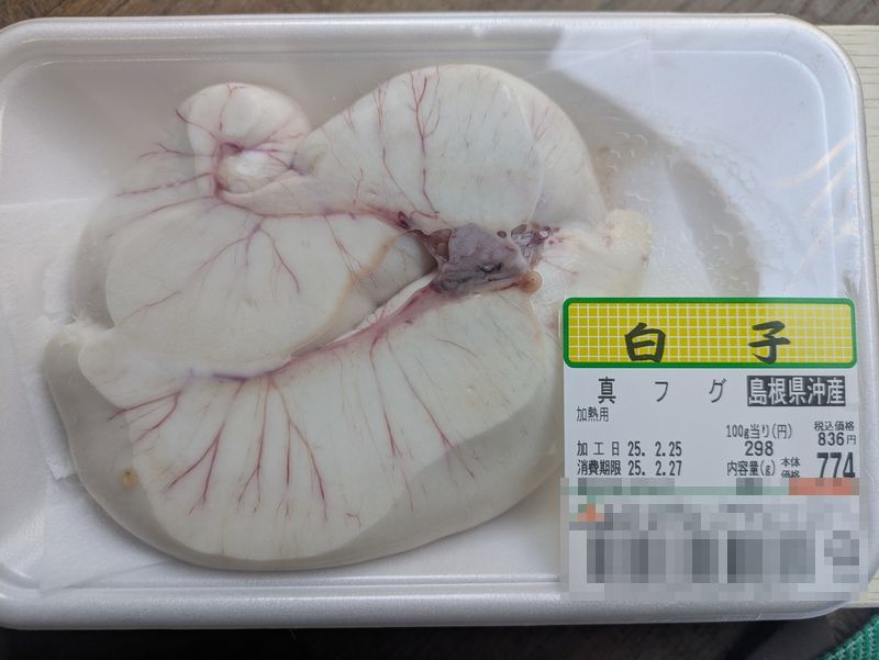 先日、真フグが売っていたので、鍋にした旨の報告をしましたが、その身はメスのだった様で、その時に白子は売っていなかったのですが、今日のぞくとフグの身と白子がセットで売られているものと、白子だけ売っている物が有り、ついつい白子に手を出してしまいました。