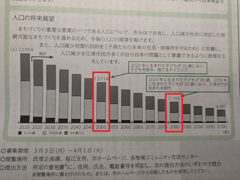 今月の江津市の市報に今後の人口推移(推定値)が出ていました。