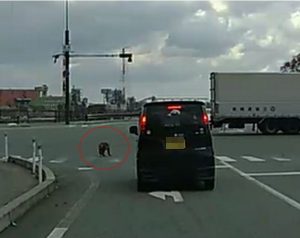 今日の14:00頃、渡津の9号線のバイパスの交差点で、信号待ちをしている時に、サルが現れ、何とか車を避けて、交差点を横断し逃げて行きました。
