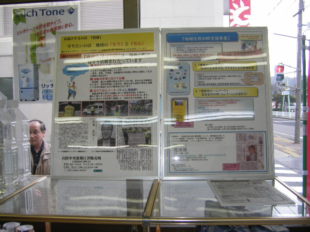 写真左 山陰中央新報江津販売所 ”夜も見守り隊”のパネル