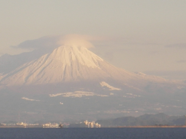米子空港から、松江へのバスの中から、雪をかぶった大山(だいせん)に夕陽が当たって、なんとも綺麗。