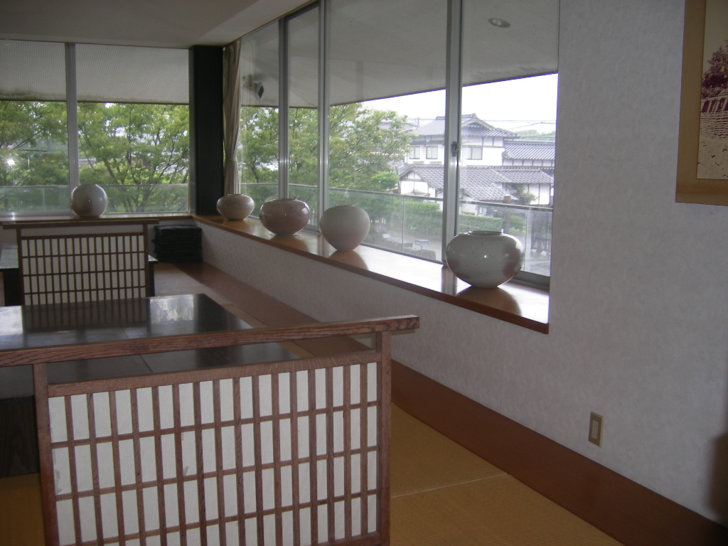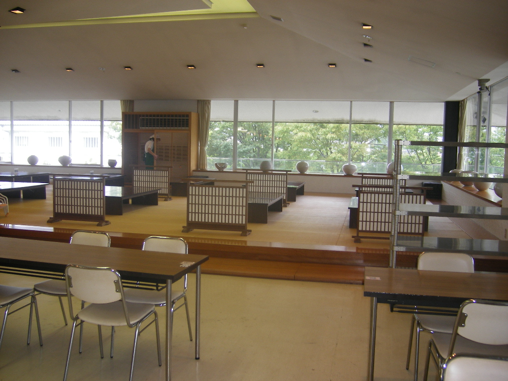 食堂の周りには、萩焼がずらっと展示してあり、なかなか豪華。