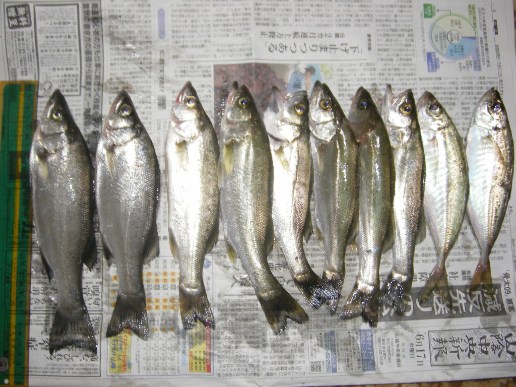 写真左の2匹が丸セイゴ、中の6匹が長セイゴ、そして右の2匹がアジ