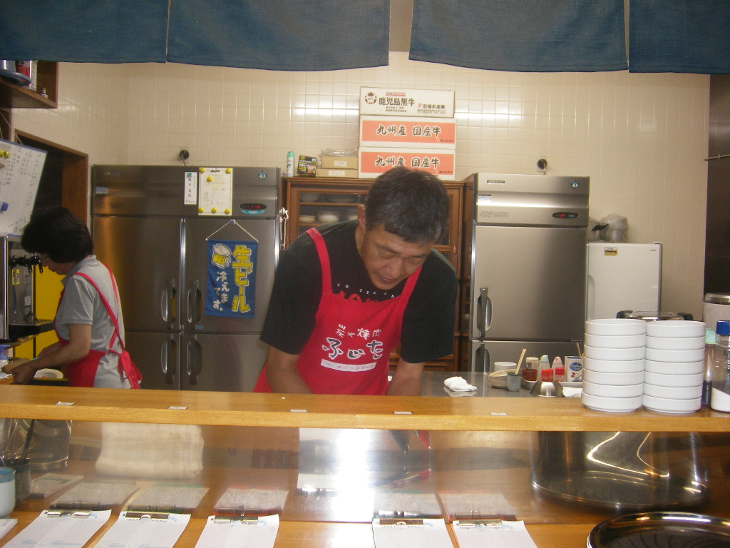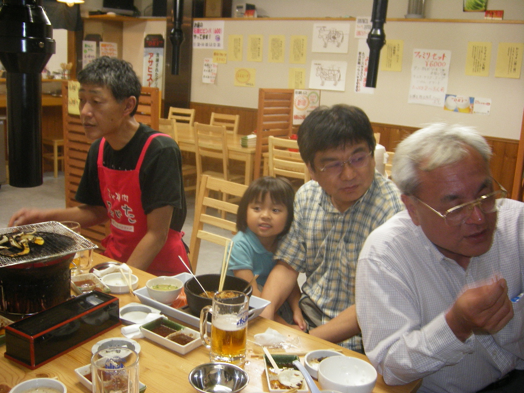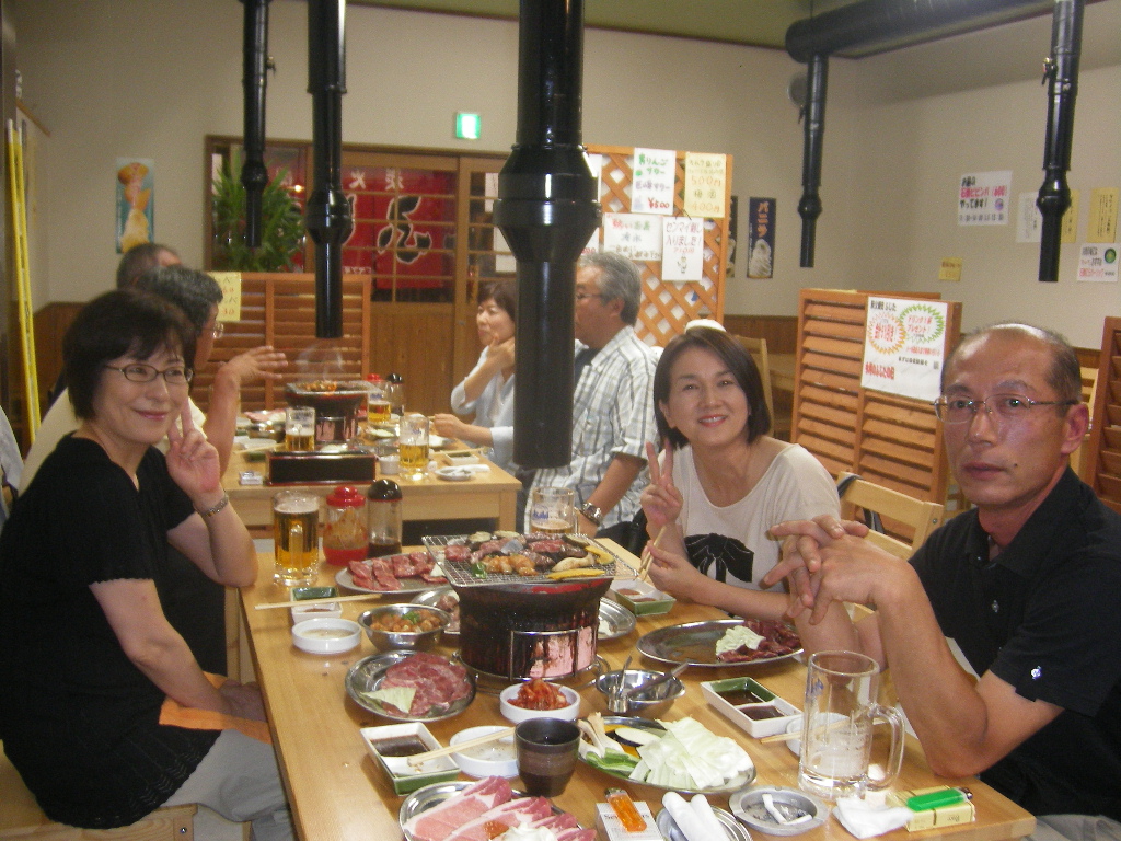 写真は、同級生の面々。右の写真は、同じ同級生の店主が一生懸命肉の準備中。