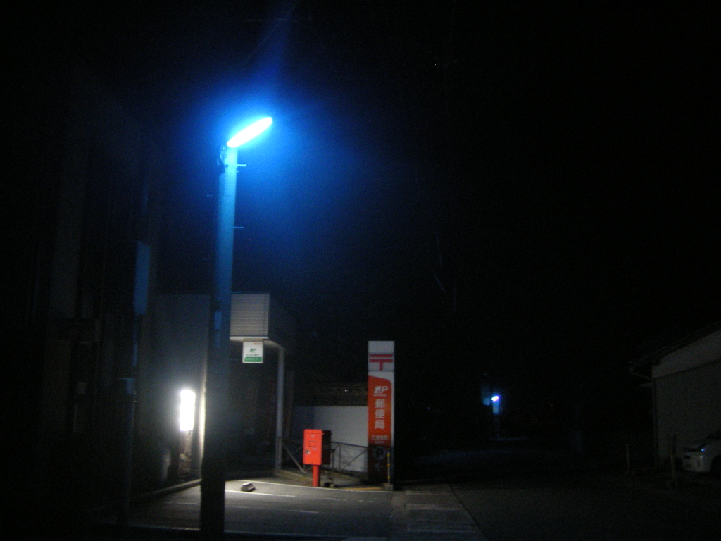 写真は、我家の隣の郵便局の所に取り付けてある青照明。