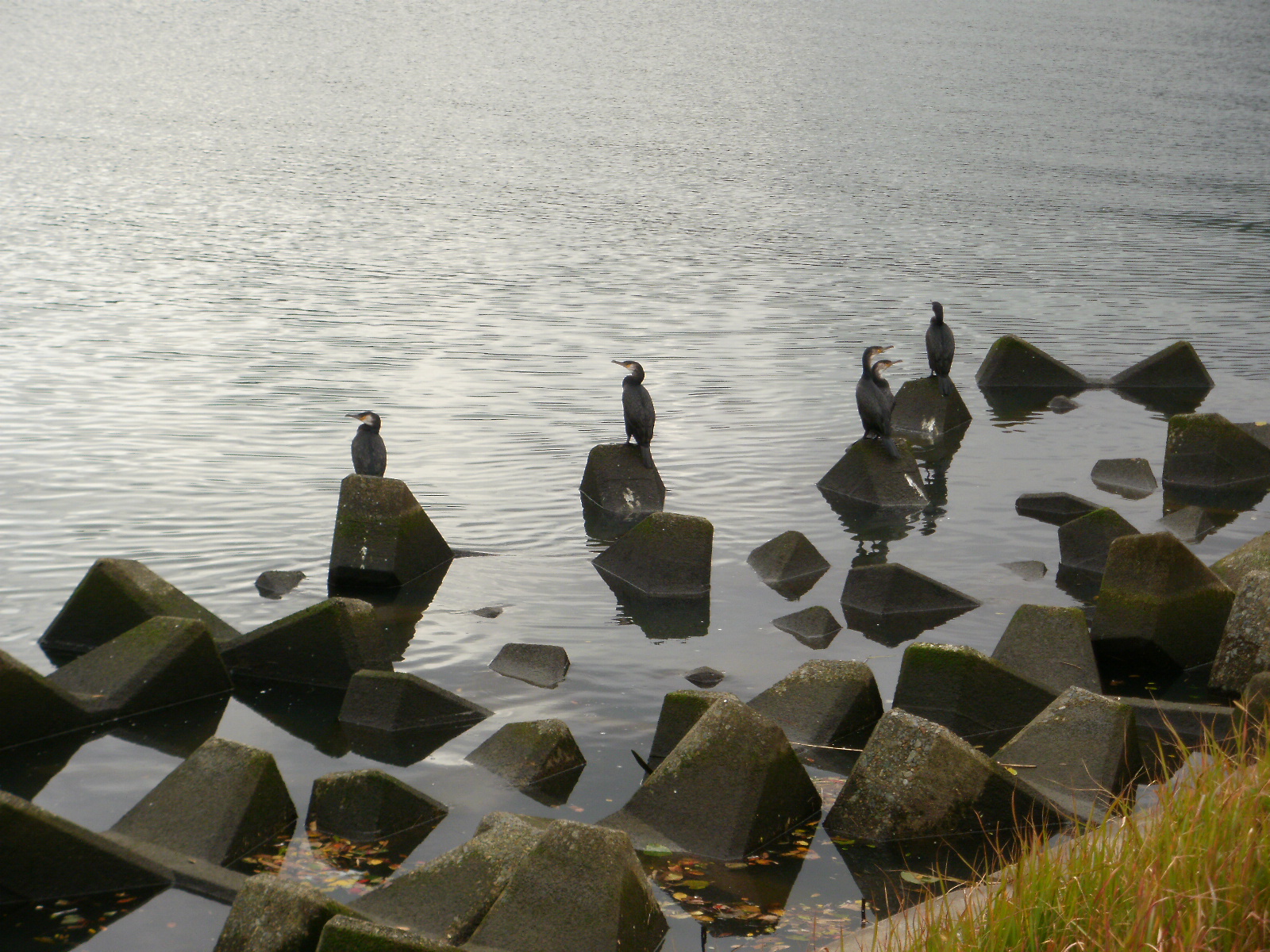 江川の土手に行ってみると、鵜とカモ(?)みたいな小さい水鳥がいた。