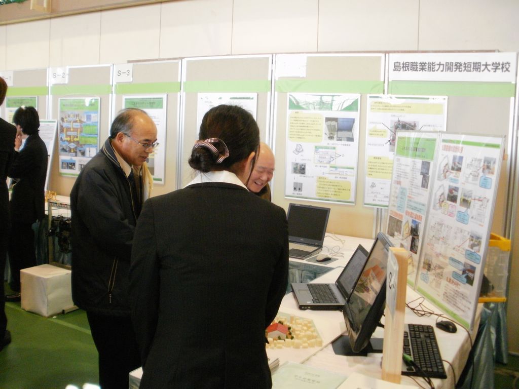 展示会場の体育館に行くと、島根職業能力開発短期大学校のブースに、時々図書館で出会う、2年生が説明員で待機。