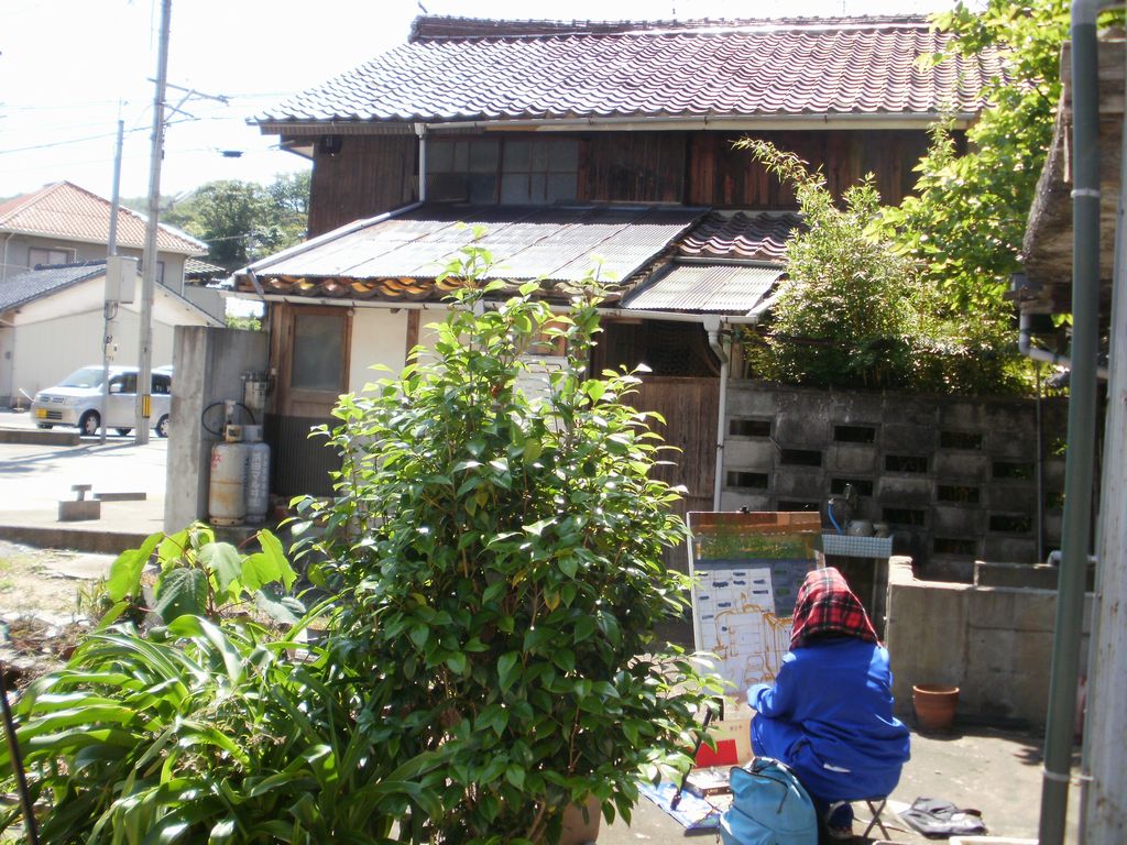 彼女は、我家の屋根を書いている真っ最中。