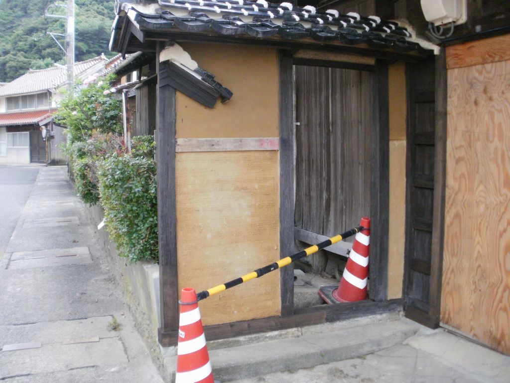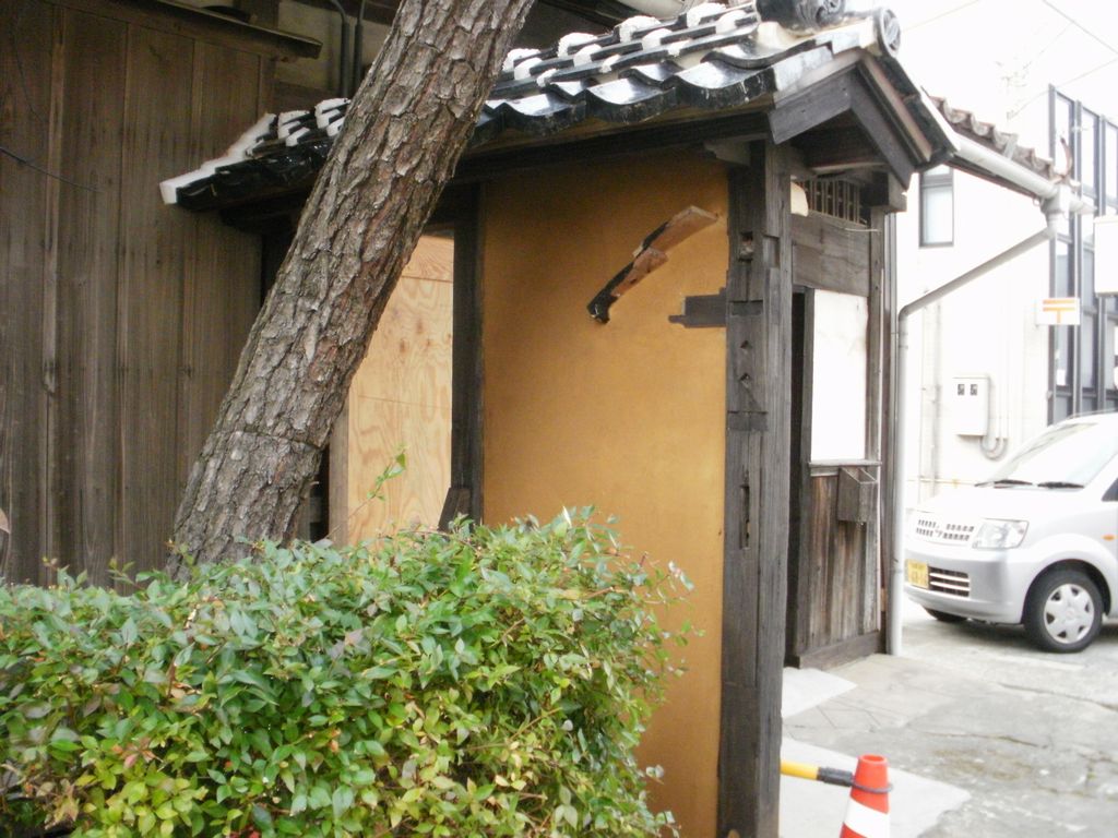 写真下の、折れた柱の部分は、接木して修復してあるが、建設当時(100年程度前)に施してあったと予想される、柿渋の塗料を塗るらしい。