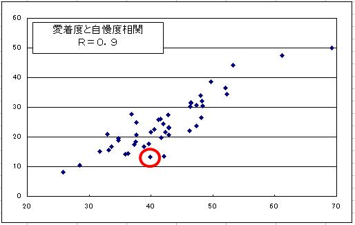相関係数が0.9もある明らかな正の相関にもかかわらず、島根県は赤丸。