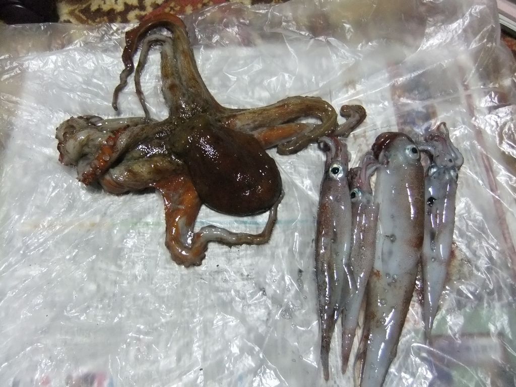 右下の大きいイカが、35cmぐらいですから、蛸もマズマズのサイズがお判りいただけると思います。
