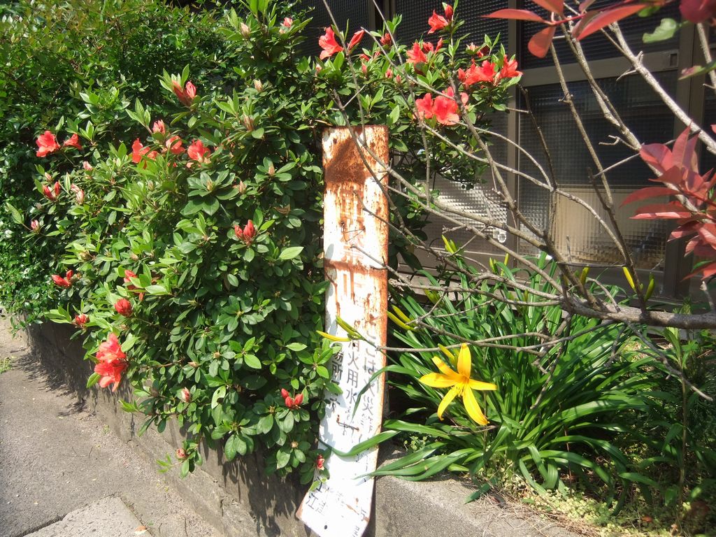 真ん中に有る、錆びた看板は、「消火栓の駐車禁止」。