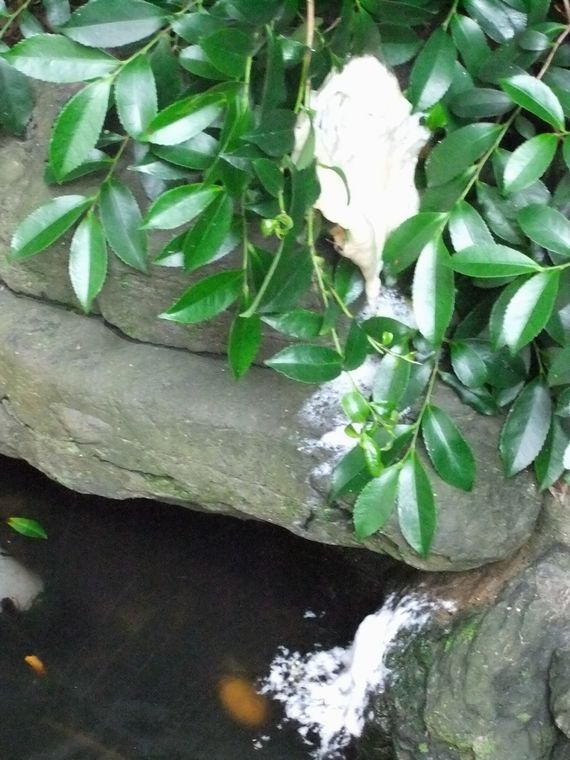 昨日の雨の為か、今朝目覚めると以前報告した我家の中庭の池の上の木にモリアオガエル産卵していた泡の固まりが、池に落ちた。