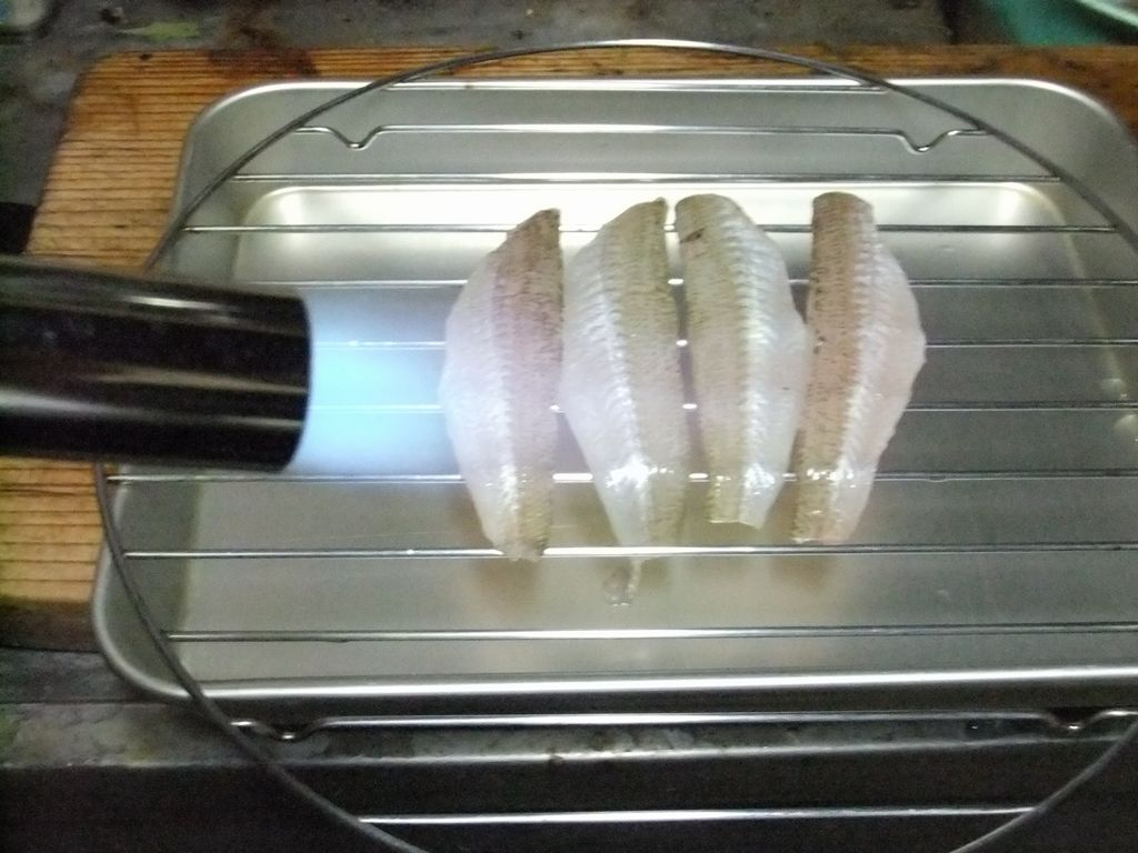 試し炙りの為、2匹分を炙りのレベルを色々と造って、氷水の中へ・・・。