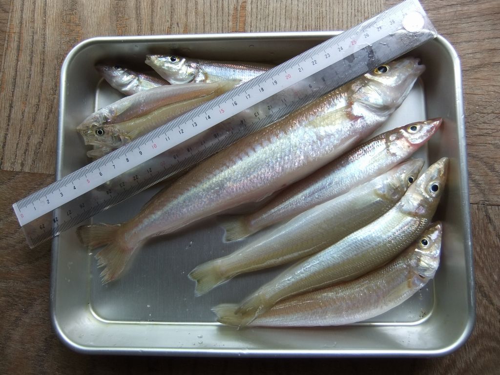 手前の4匹のキスが19cm程度の天ぷらサイズ。