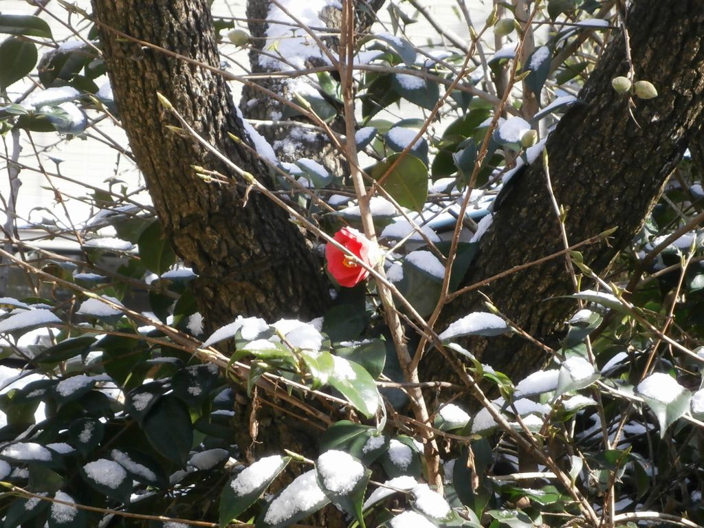 中庭の木々にも少し白い物があり、その中に1輪の赤いつばきが咲いていた。