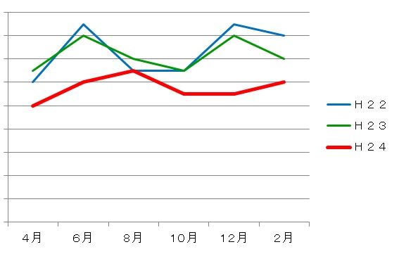 H22年(青)とH23年度(緑)の推移は、ほぼ同じなのに対し、H24年度(赤) は明らかに下がっているのが、判りますでしょうか?