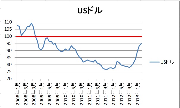 イメージ的には、もう少し前から90円台だった気がしていたが、データ(月平均)をグラフ化してみると、徐々に、約4年間で70円台まで円高に推移している。
