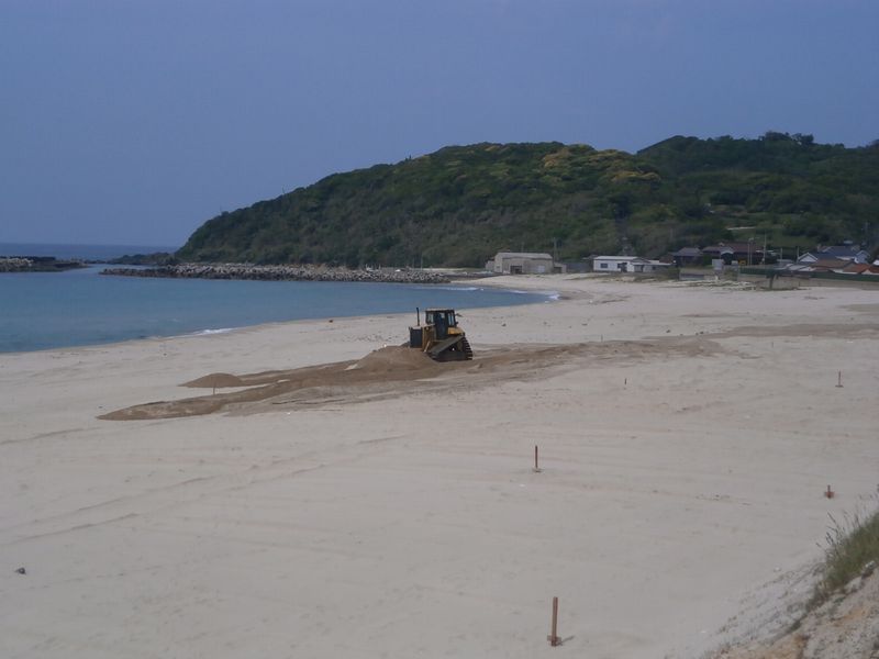 砂浜に、ブルドーザーみたいな物が入っていた。砂浜を整備しているのか?