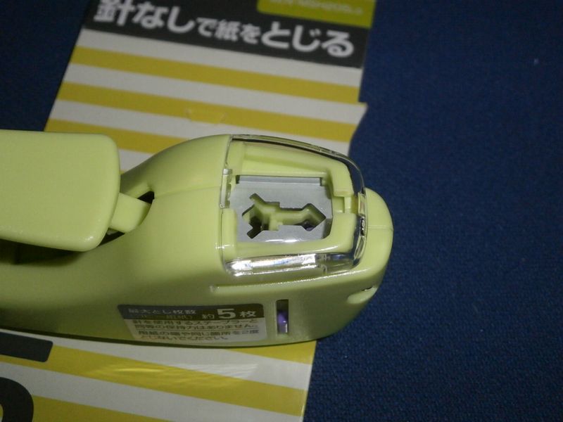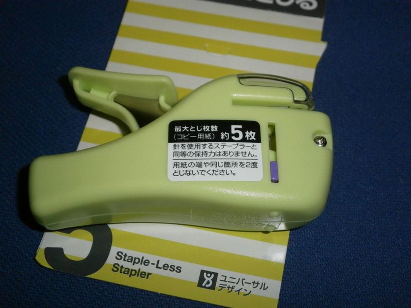 針を探している時に、目についたのが「針なしで紙をとじる。」と書いてある文具。