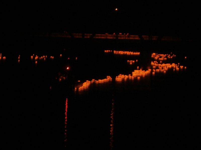今まで、流れが速かったのか20時前だと既に河口に流れていて見る事が出来ないのだが、今年は流れが無かった様で、灯篭が固まっていて撮影できた。イメージが湧きますでしょうか?