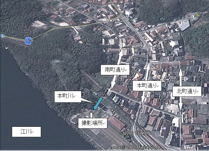 写真撮影の場所で、江川をバックに南町通り方面を撮影したのが下記の写真。