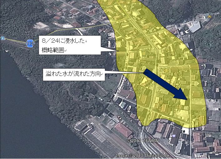 本町冠水の概略範囲(詳細は確認できていません。)は、下記写真の通り。