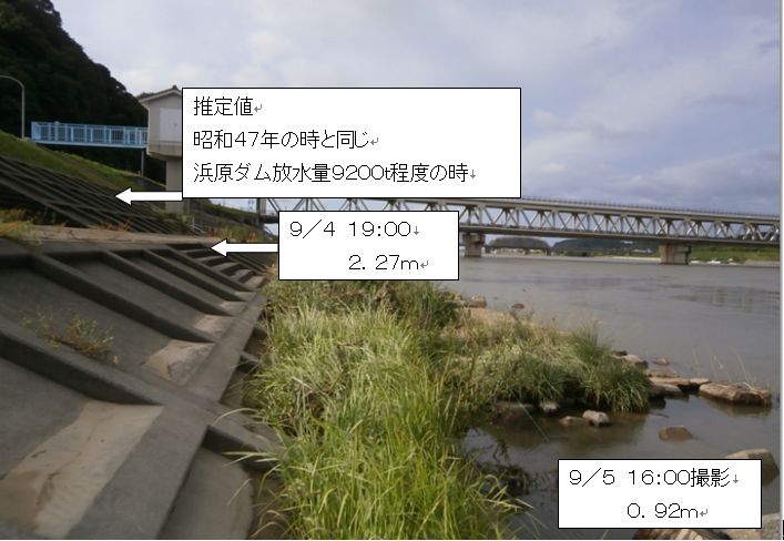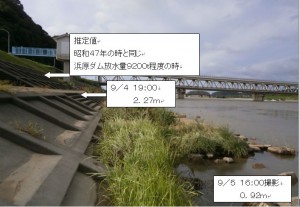 《浜原ダム放水量》 9/4 7:30 1900t 8:00 2063t 9:15 2355t 10:30 2702t 11:00 3183t