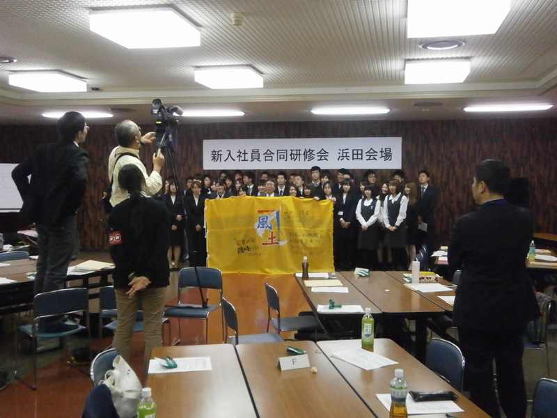 上記の写真は、新入社員合同研修の会場でのインタビュー模様。