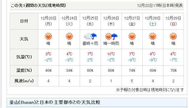 26日から釜山に行くが、「釜山は寒い」と言われていたので、少し調べてみると週刊天気予報が・・・。