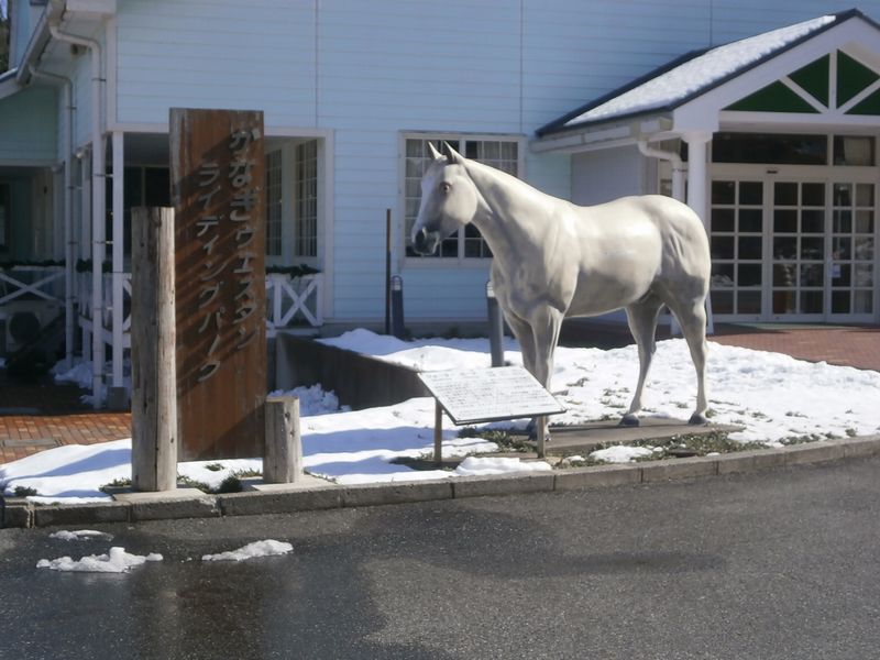 下記の写真は、ウエスタンパークで昼食をとった時の物。馬の置物の下は雪。