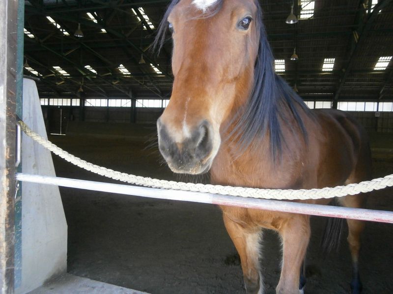 下は、厩舎から顔を出しているお馬さん。