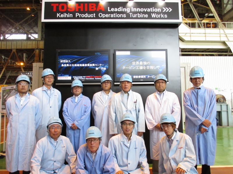 工場内唯一撮影が許される、土光元社長が設計されたタービンの前と、工場入口にある掲示板の前で記念撮影。