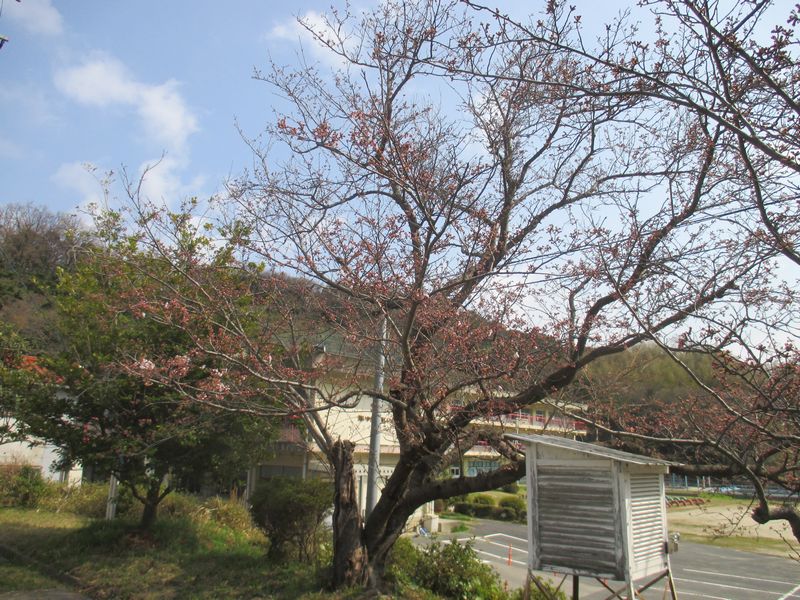 10時半ごろ、郷田小学校の体育館前の桜の様子を見に行ったが、つぼみも膨らみ今にも咲く感じに見えたが、開花では無かった。