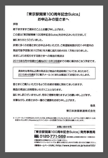 「東京駅開業100周年記念Suica」の商品が遅れるとの詫び及び連絡のハガキ。