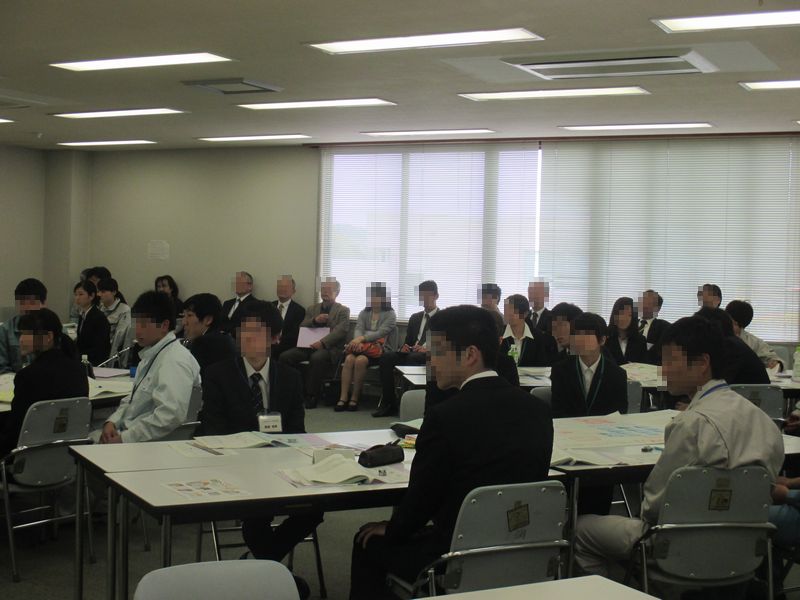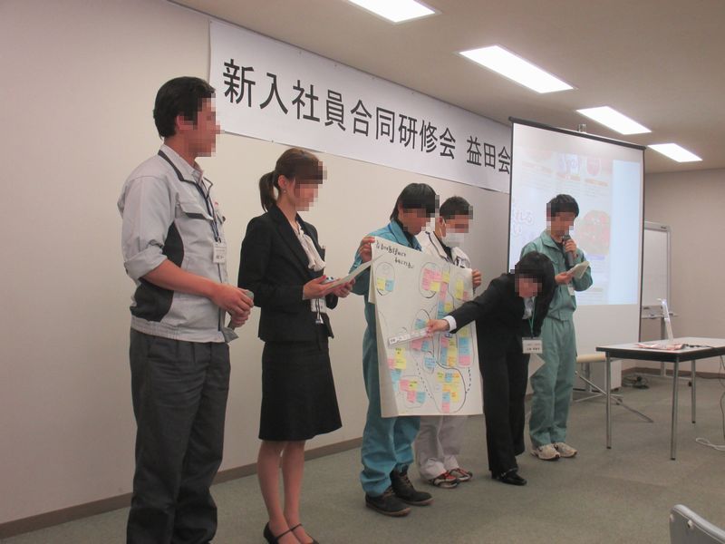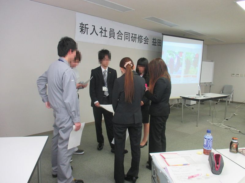 6名程度でGr分けされていて、各Grを会社に見立て、各会社の社長の指示の基、地域の産物をお借りし、自社の商品として更なる販売量を増加させる為の施策等を論議してもらい、その結果と、各自が作成した新入社員決意カードの発表を各会社の上司が参列していただいている中実施した。