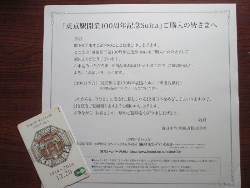 昨日、「東京駅開業100周年記念Suica」が、やっと手元に届いた。