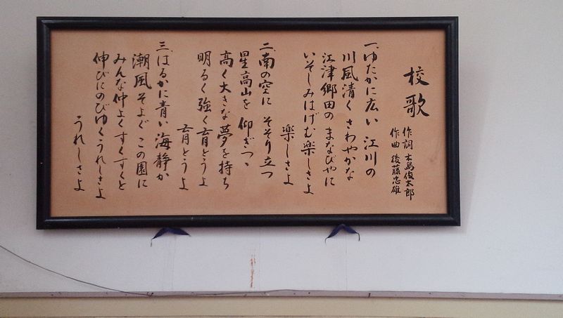 その時に、何気に体育館のステージに向かって左側に校歌が掲示してあるのに気が付きました。