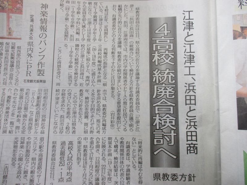 朝刊に、江津、浜田の高校統廃合を検討する事になったと。