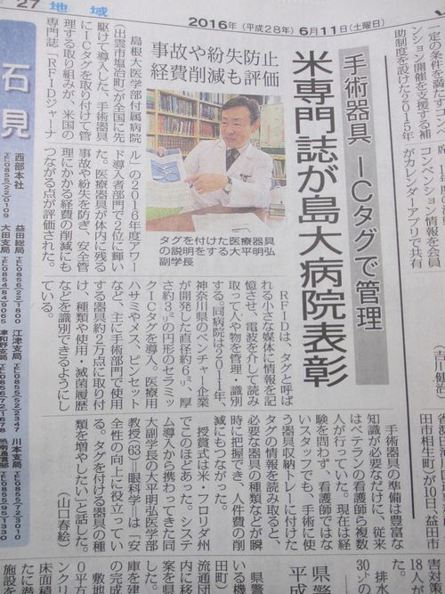 島根医科大学で、手術器具にICタグを取り付け管理する仕組みが、米国の専門誌「RFIDジャーナル」の2016年度アワード導入部門で2位に輝いたと。