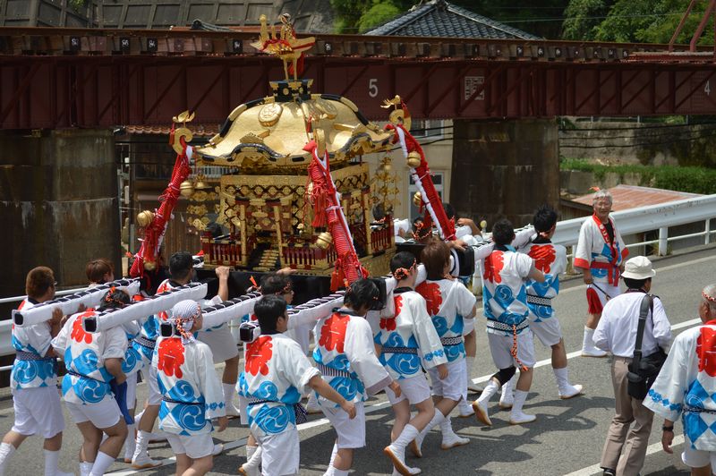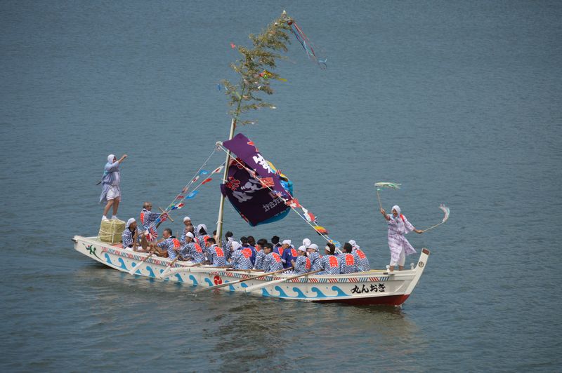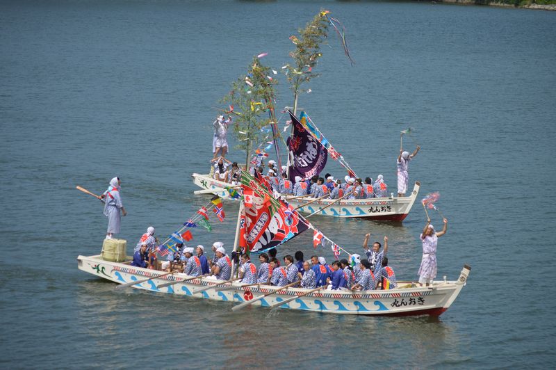 前回までは、神輿は2段橋のすこし上流の船着場から、船に乗せ、川渡神事が行われ、国道9号線の下流の船着き場から上陸していた。