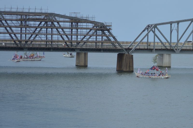 写真の左側の陸橋の向こうに見えるのが、神輿を乗せた船。