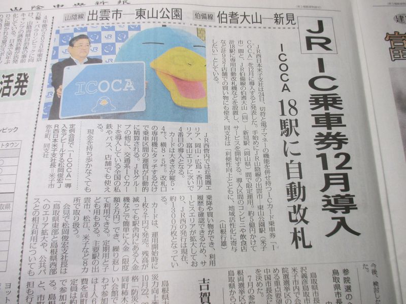 今日の山陰中央新報に、ICOCA(交通系カード)が、山陰線に・・・。と報道。