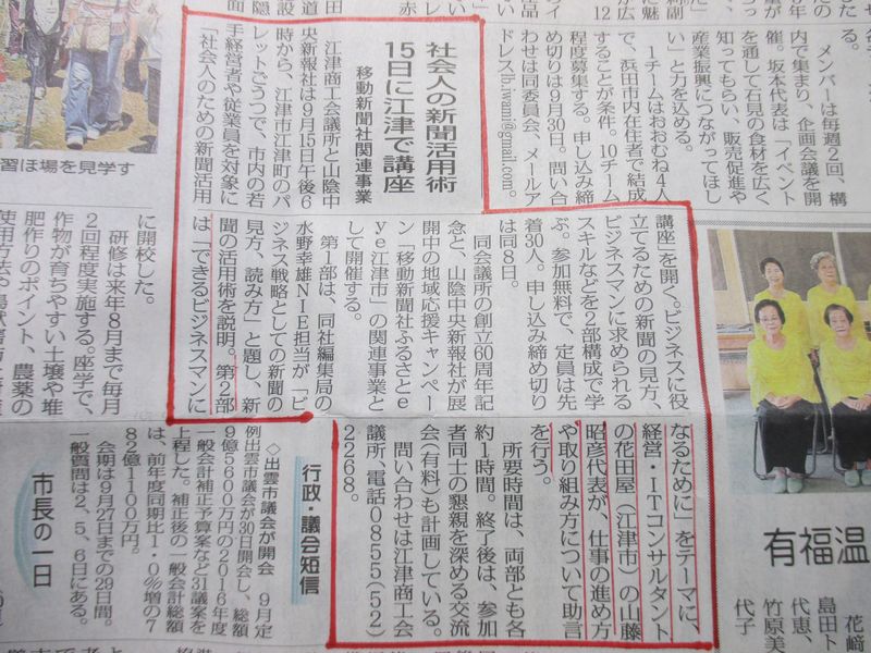 本HPでも、新入社員研修の時などで「今朝、新聞を読んできた人。」と質問して、「がっかりする人数」だったと報告している事が、山陰中央新報の執行役員の方の耳に入った様で、そのご縁での依頼だった様だ。