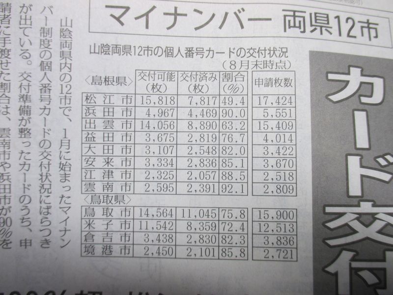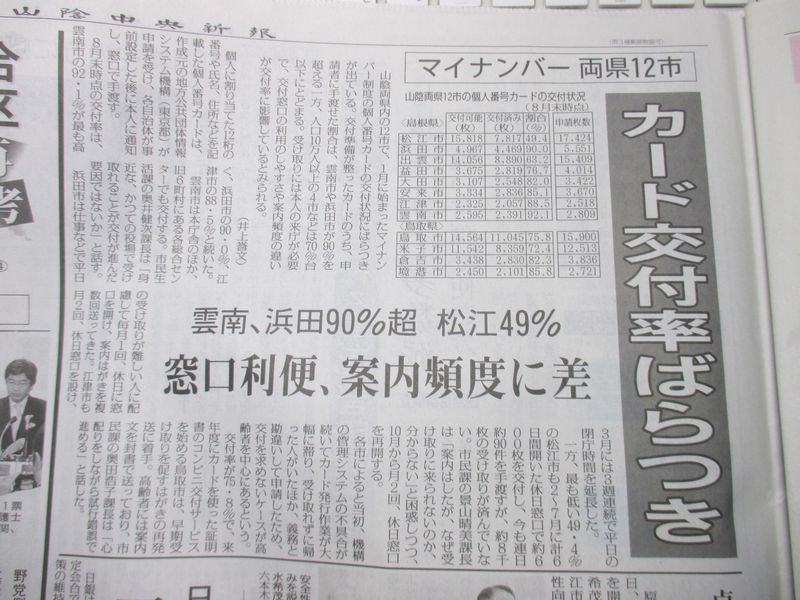 県内の交付率は、浜田市の90%、江津市の88.5%と高く、松江市は49.4%と低いとの記事。