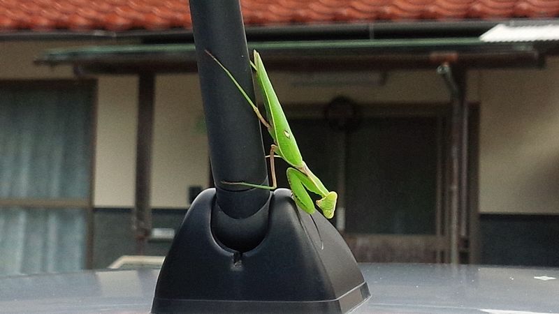 出かけようと車に行くと、なんとアンテナにカマキリ。