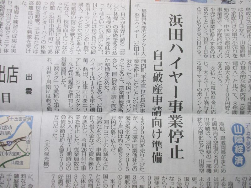 浜田・江津でタクシー事業を展開していた浜田ハイヤー(通称 浜タク)が事実上倒産した。