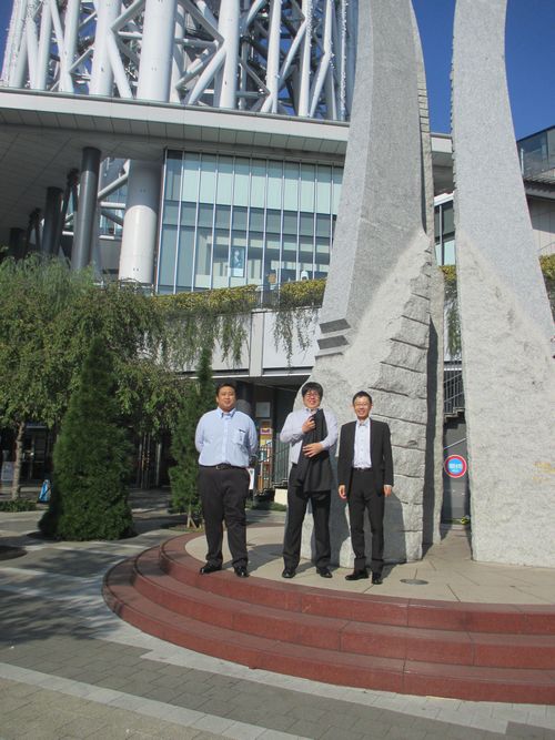 スカイツリーの3本の石のオブジェ前で記念撮影。
